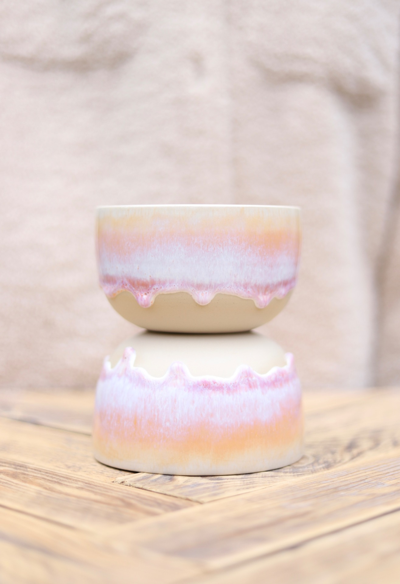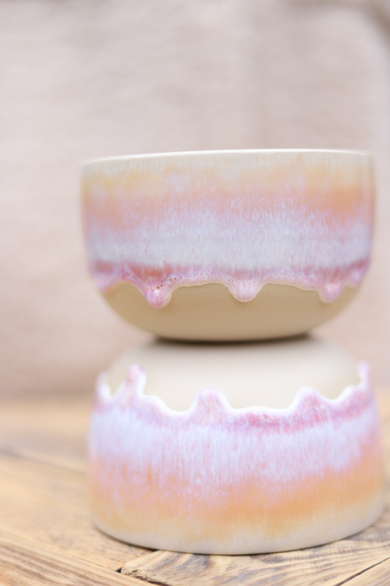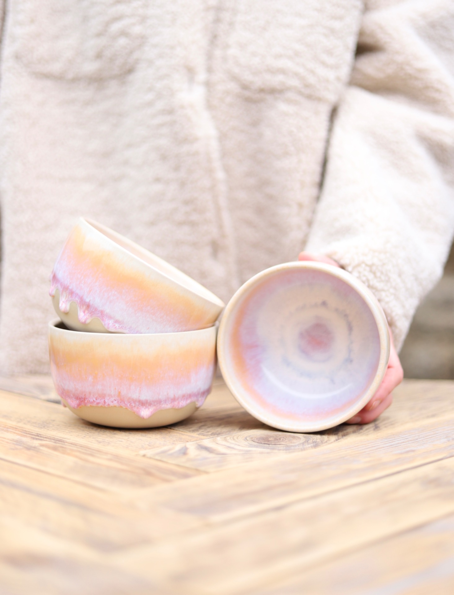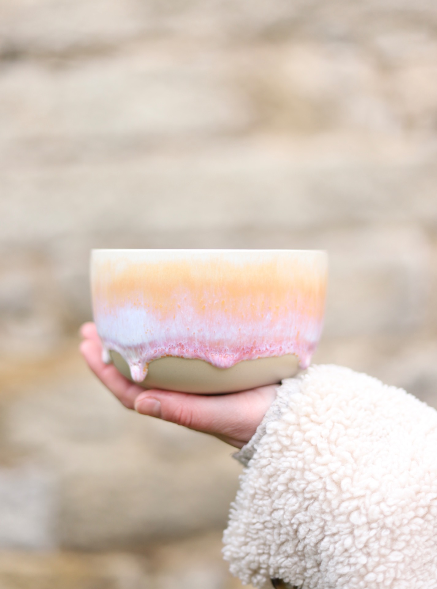 Miska s objemem cca 550ml s červánkovou glazurou. Je vytočena z béžové kameniny a vypálena na vysoké teploty.