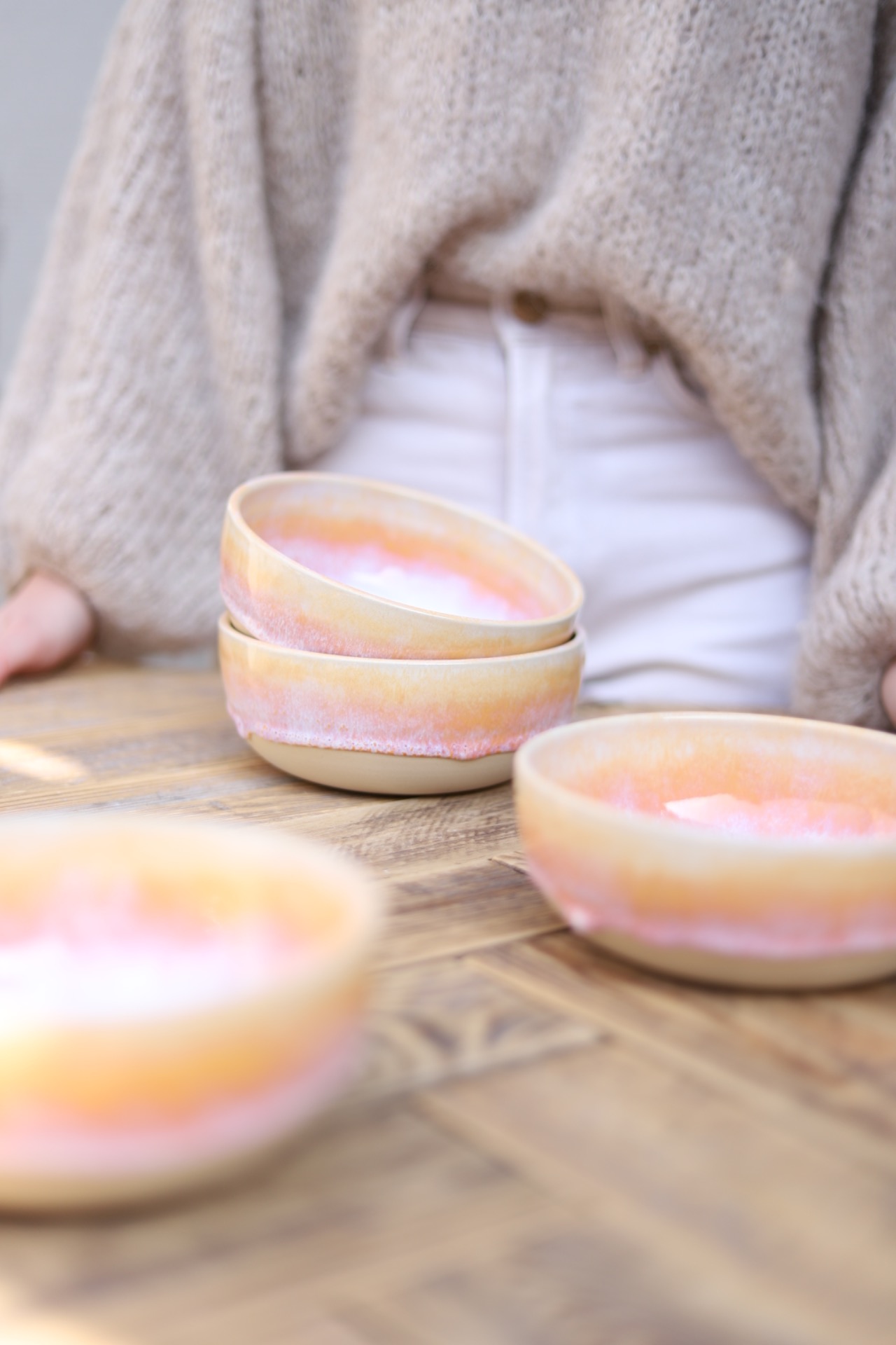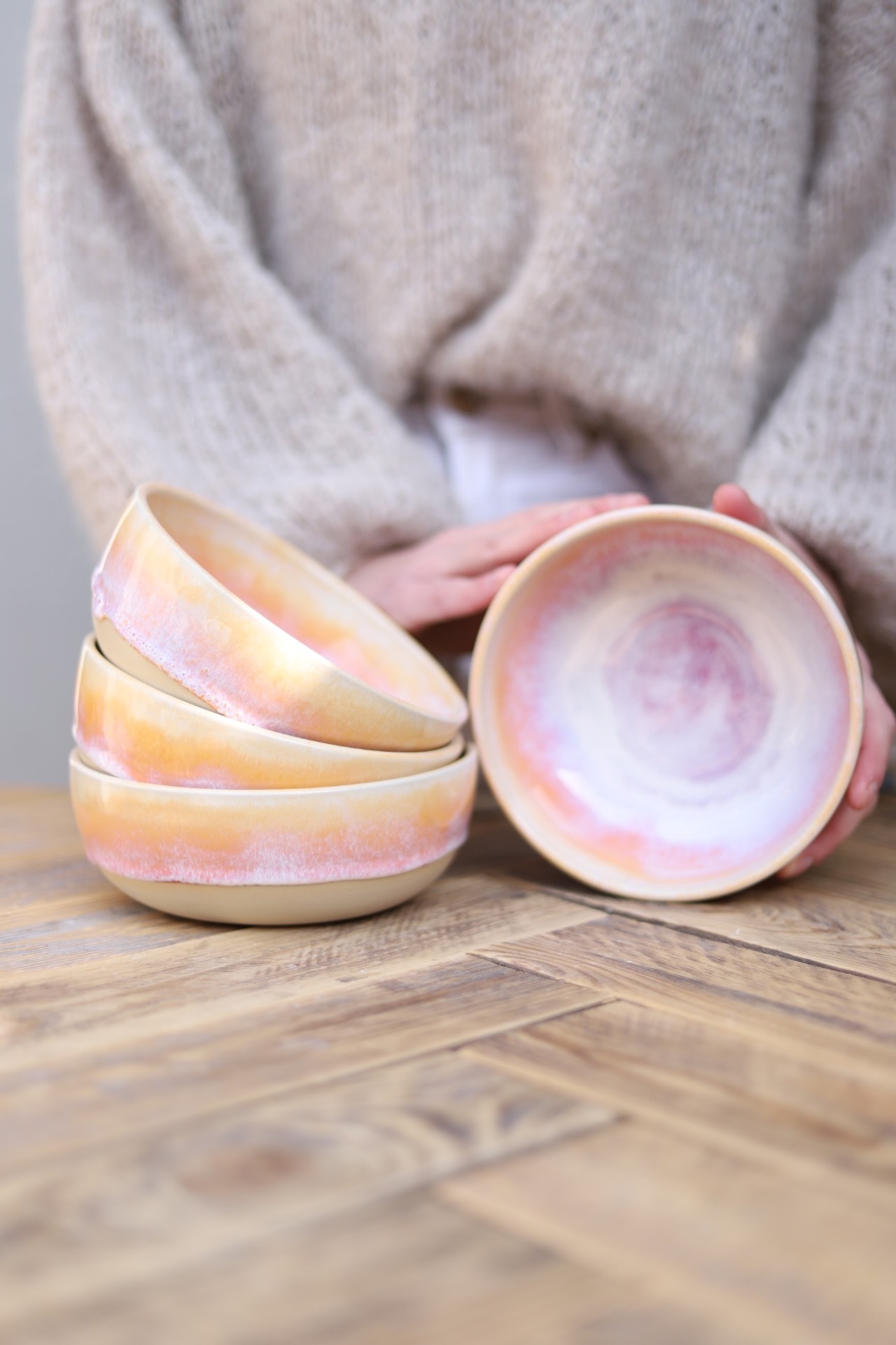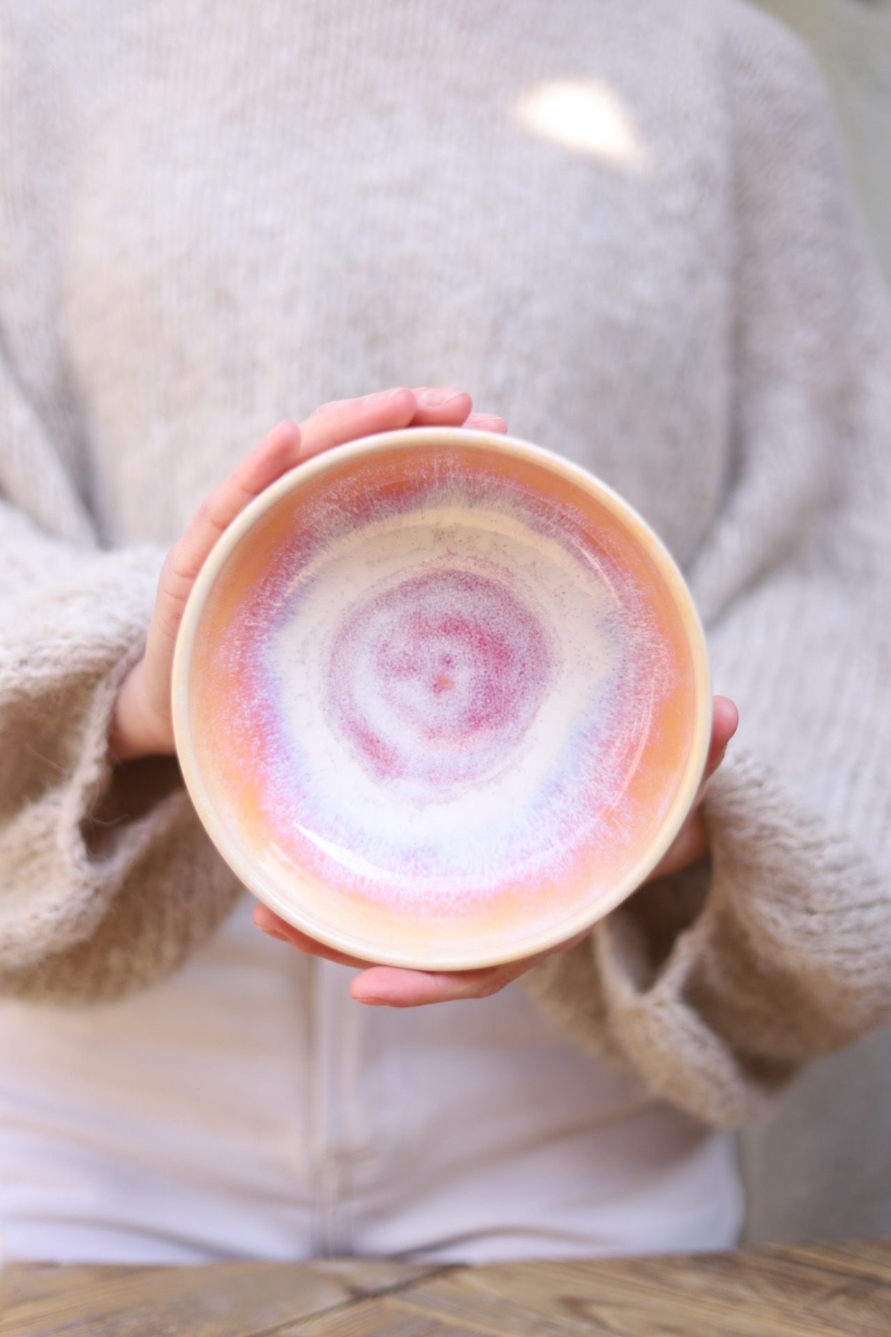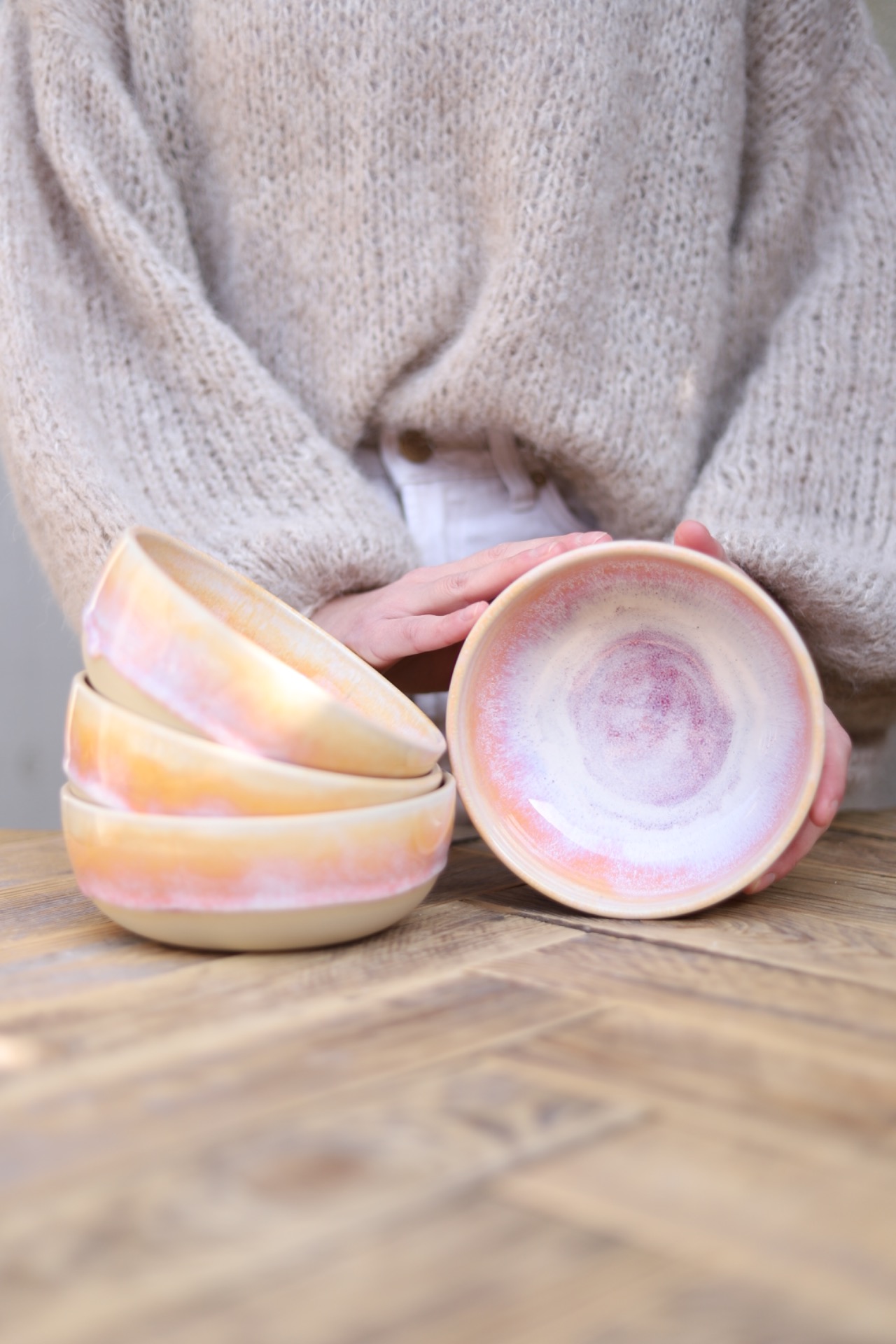Miska s objemem cca 550ml s červánkovou glazurou. Je vytočena z béžové kameniny a vypálena na vysoké teploty.