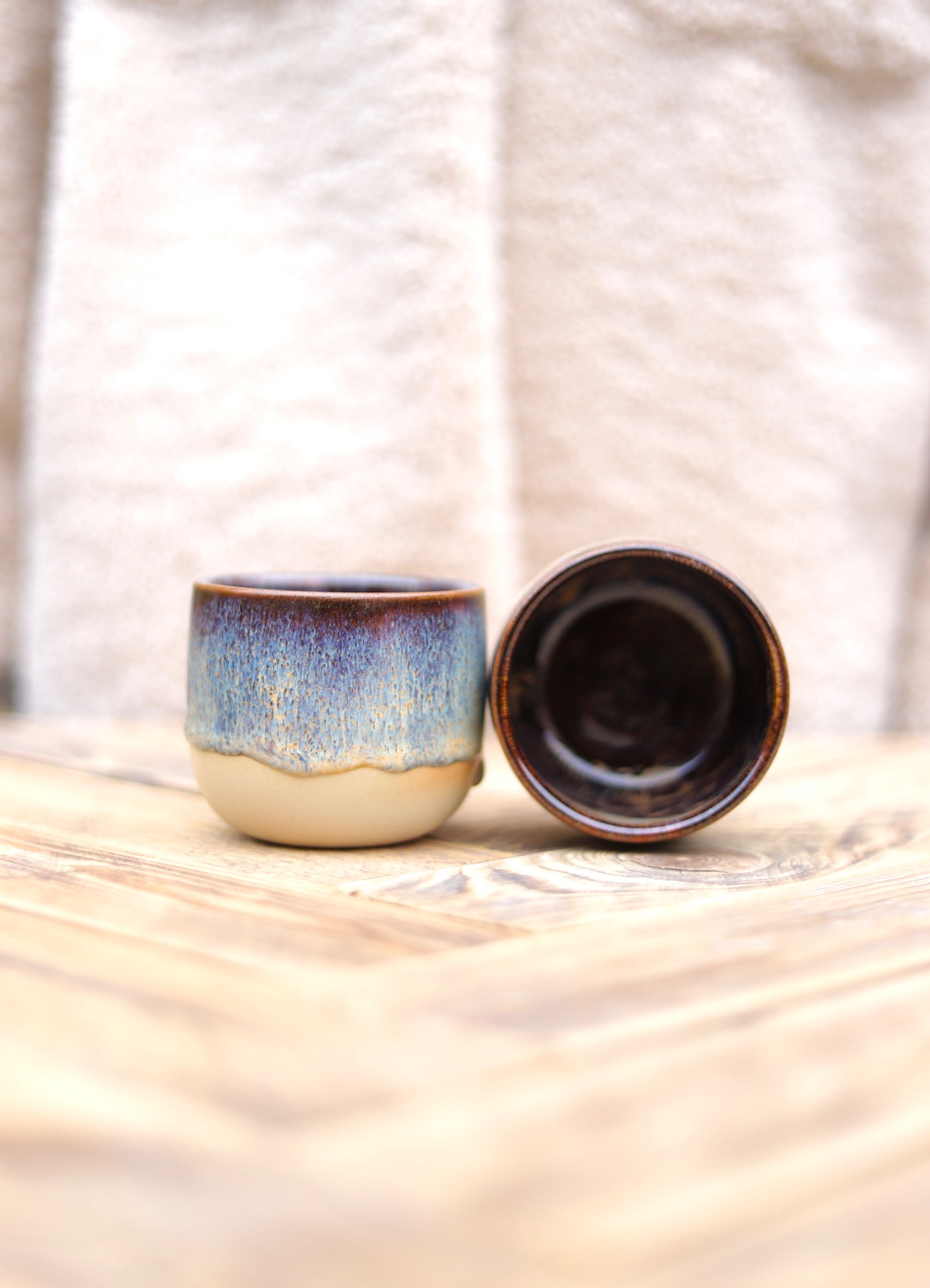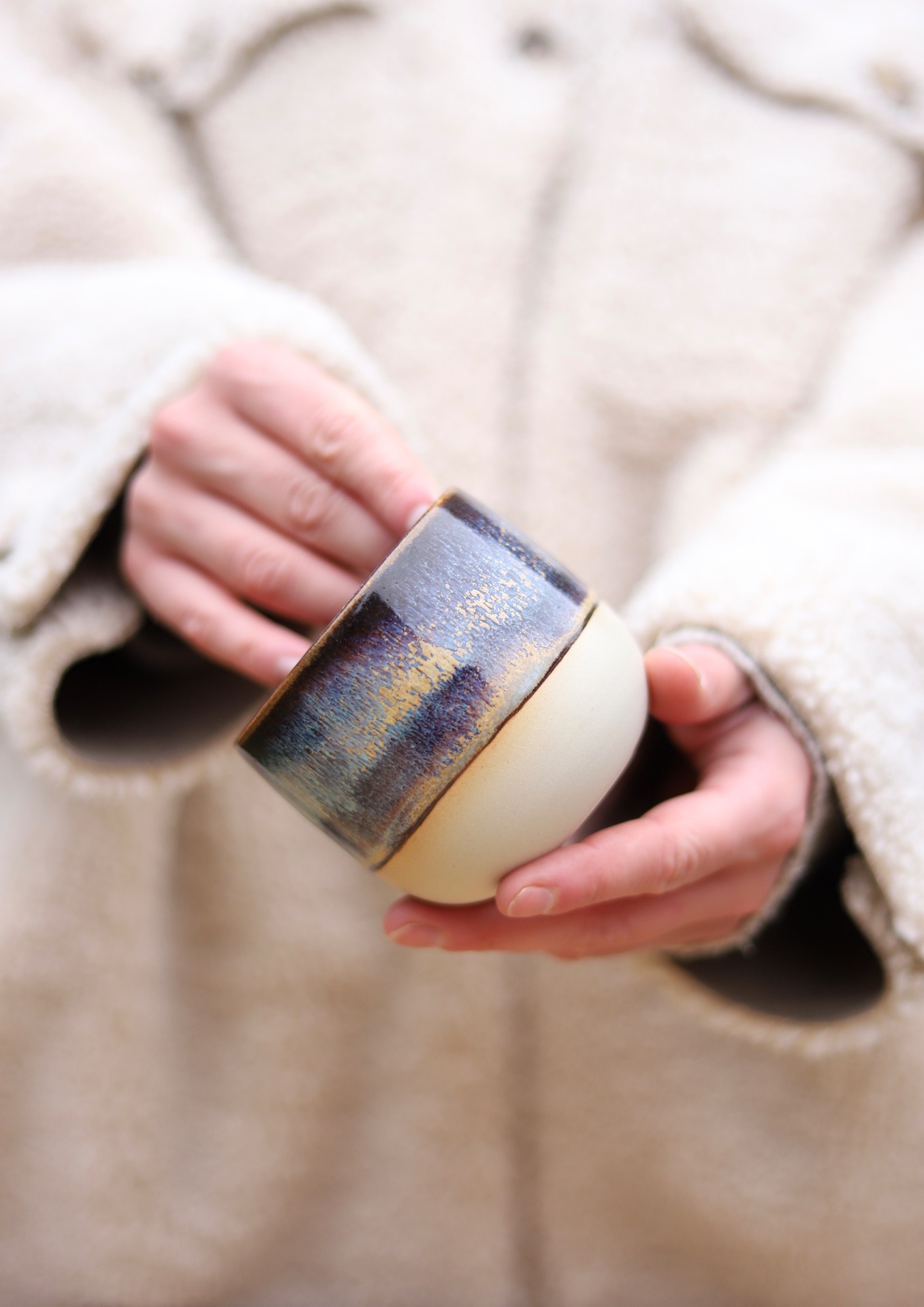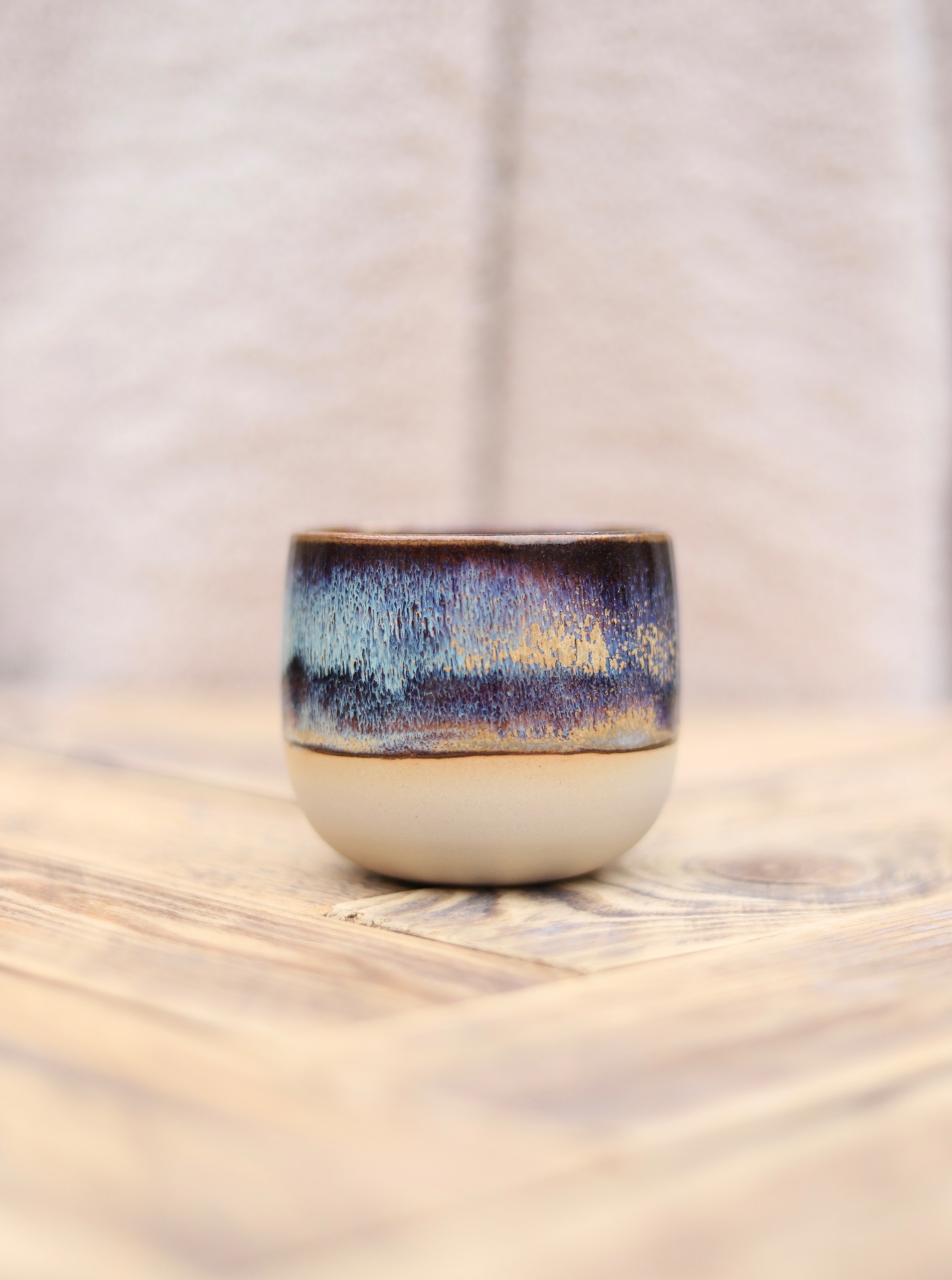Kalíšek na kafe i čaj s objemem cca 220-240ml s efektní glazurou se zlatými krystalky. Je vytočen z béžové kameniny a vypálen na vysoké teploty.