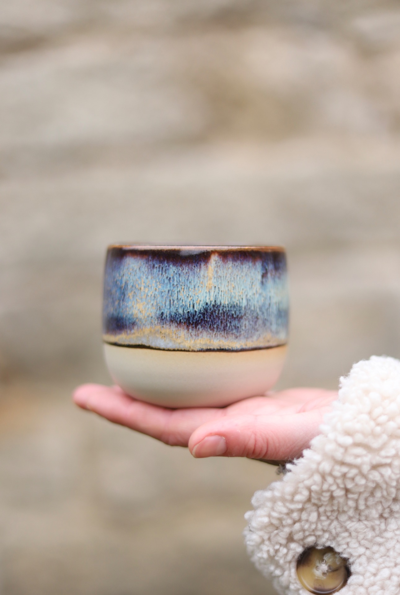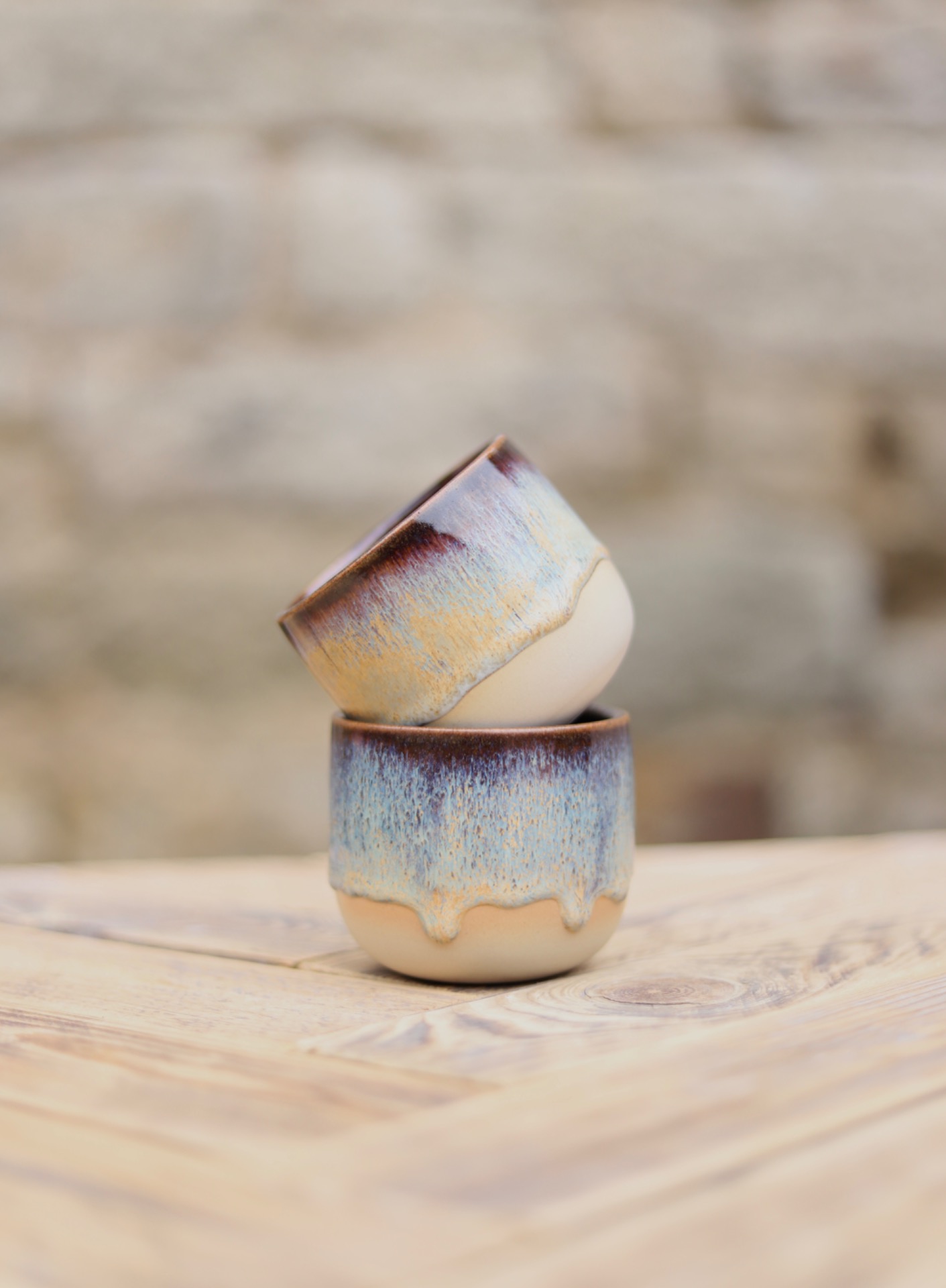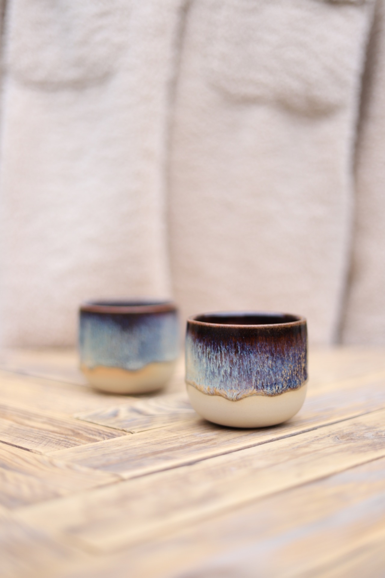 Kalíšek na kafe i čaj s objemem cca 220-240ml s efektní glazurou se zlatými krystalky. Je vytočen z béžové kameniny a vypálen na vysoké teploty.