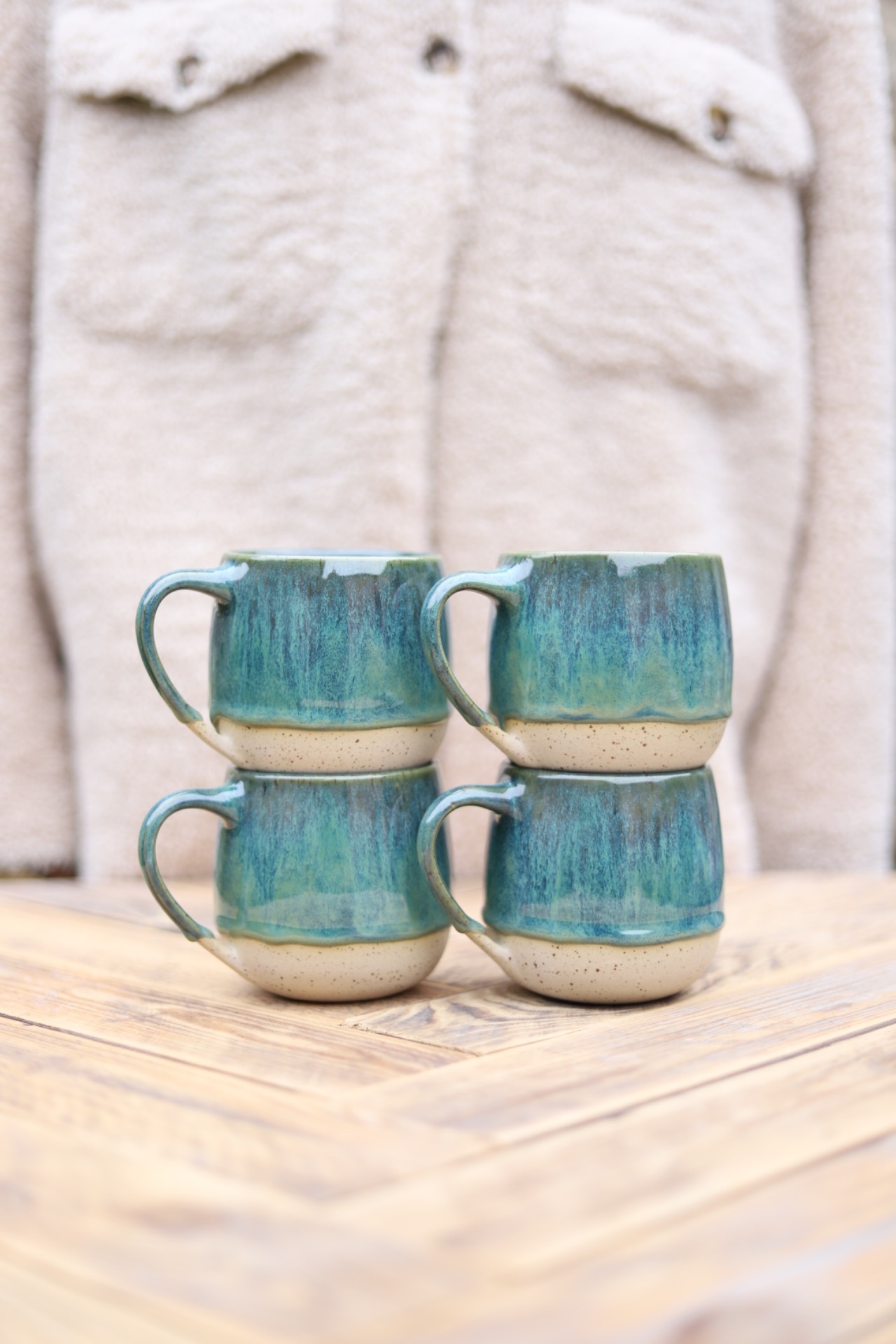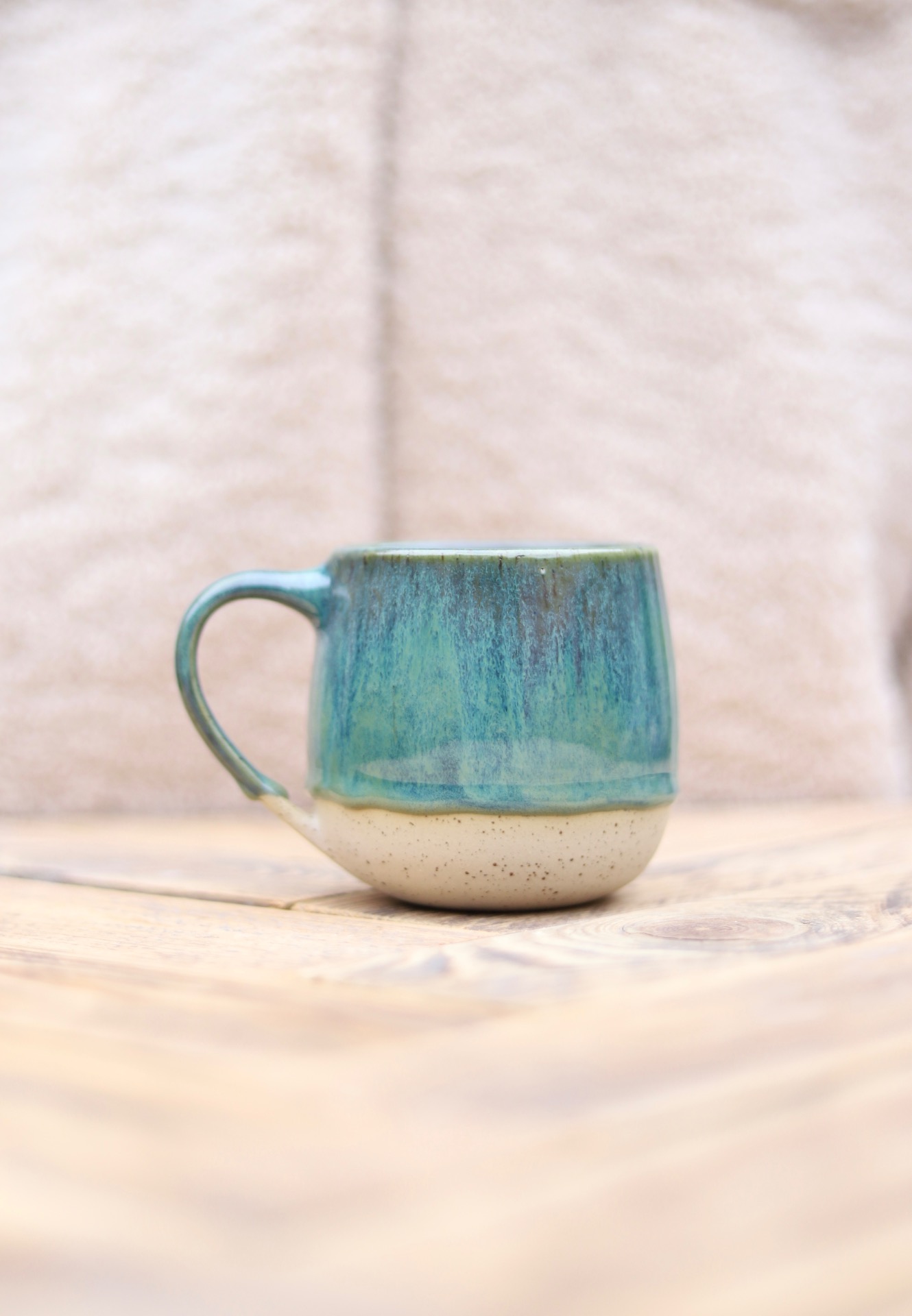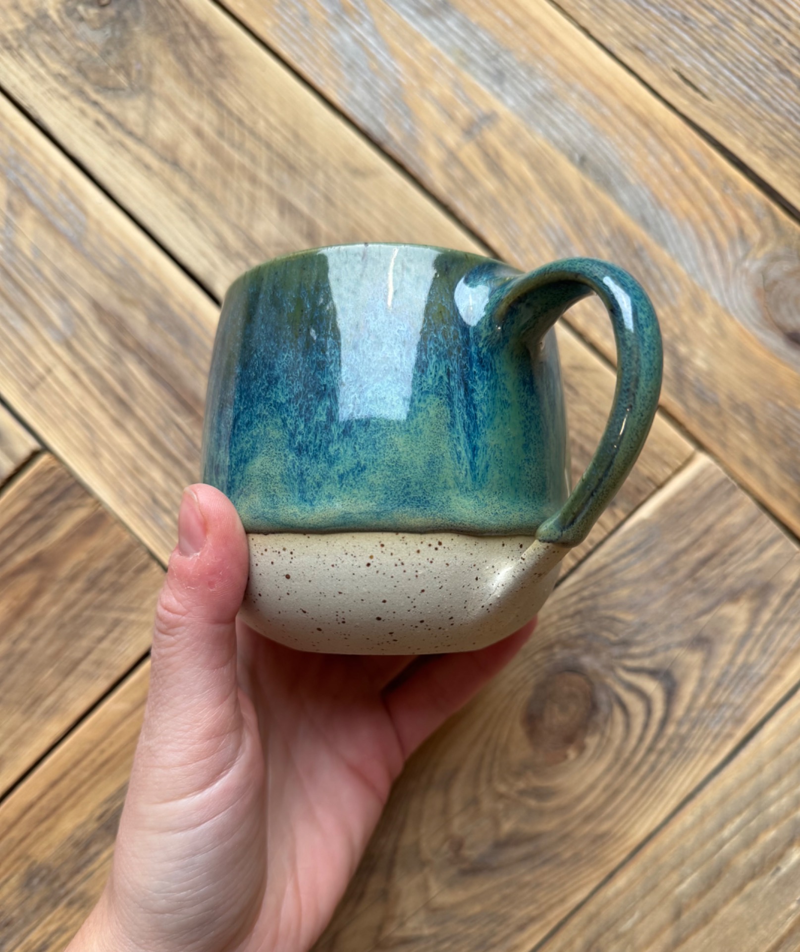 Hrnek na čaj s objemem cca 360-380ml s divokou zelenou glazurou. Hrnek je vytočen z tečkované kameniny a vypálen na vysoké teploty.