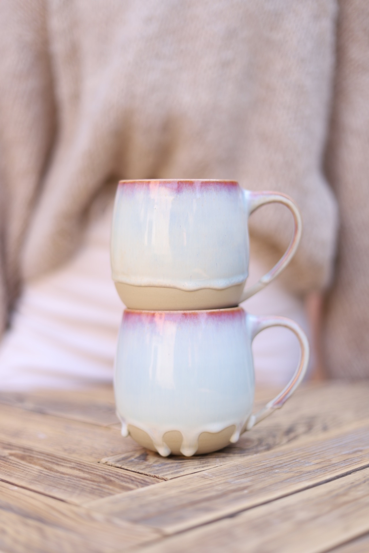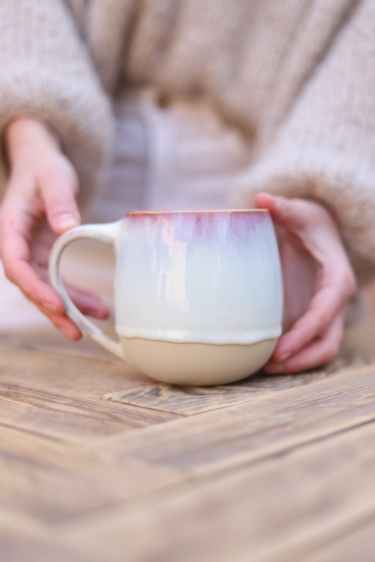 Hrnek na čaj s objemem cca 500ml s perleťově růžovou glazurou. Hrnek je vytočen z béžové kameniny a vypálen na vysoké teploty.