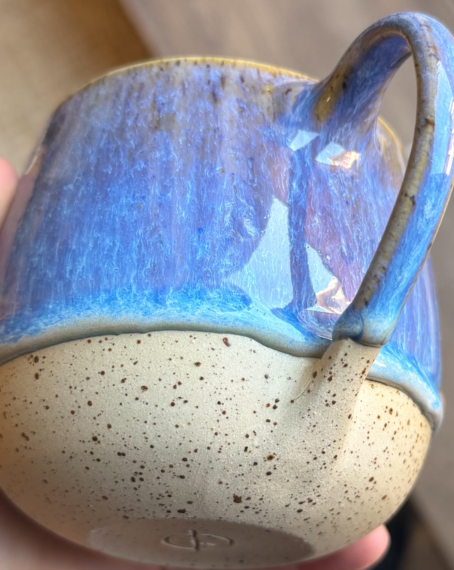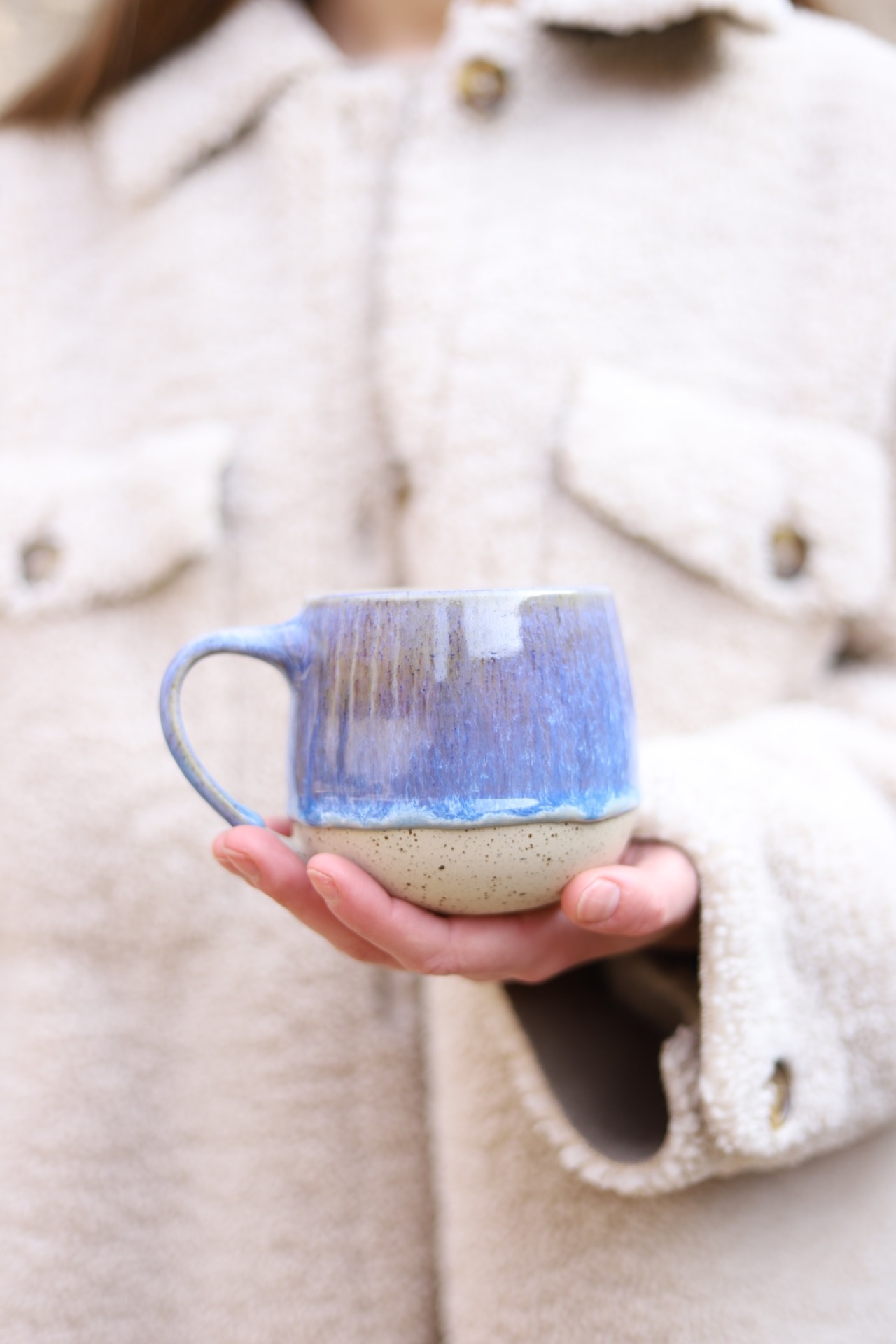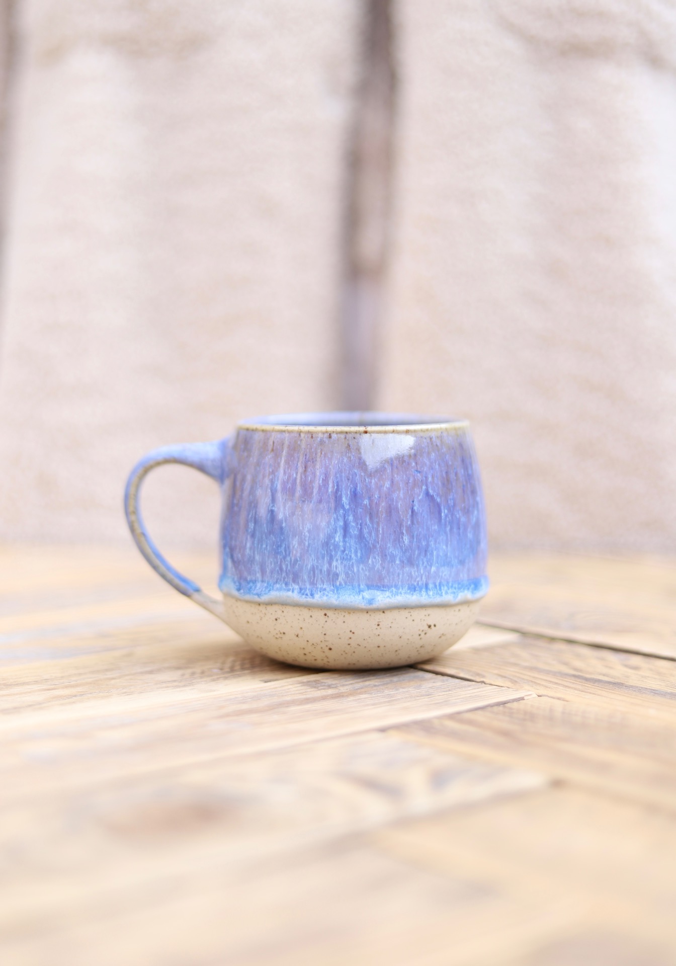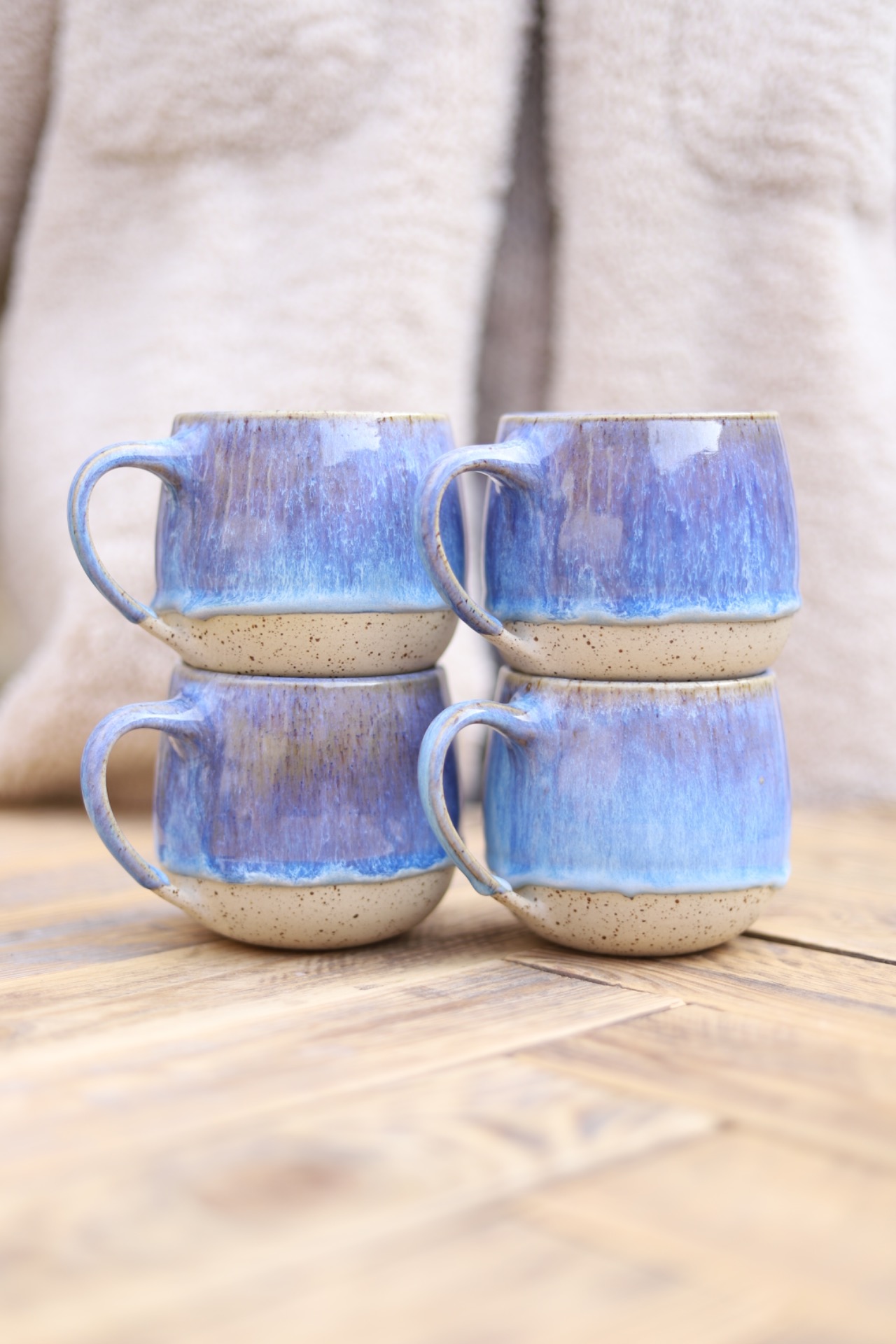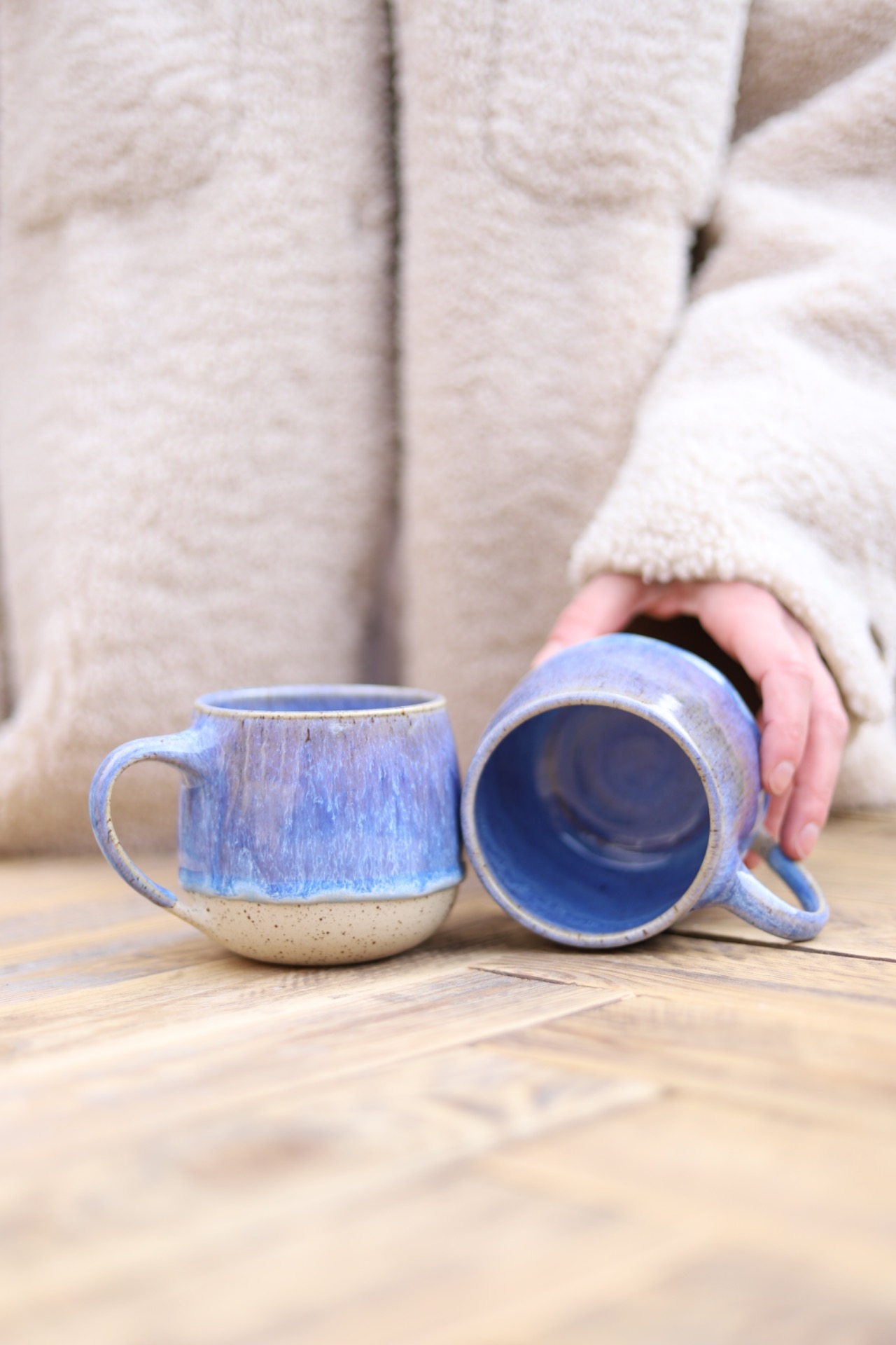 Hrnek na čaj s objemem cca 350-380ml s divokou modrou glazurou. Hrnek je vytočen z tečkované kameniny a vypálen na vysoké teploty.
