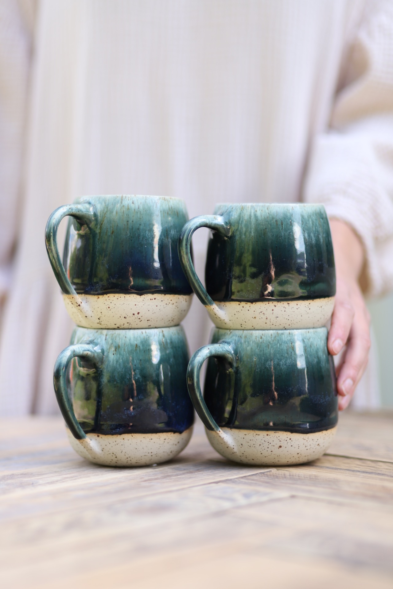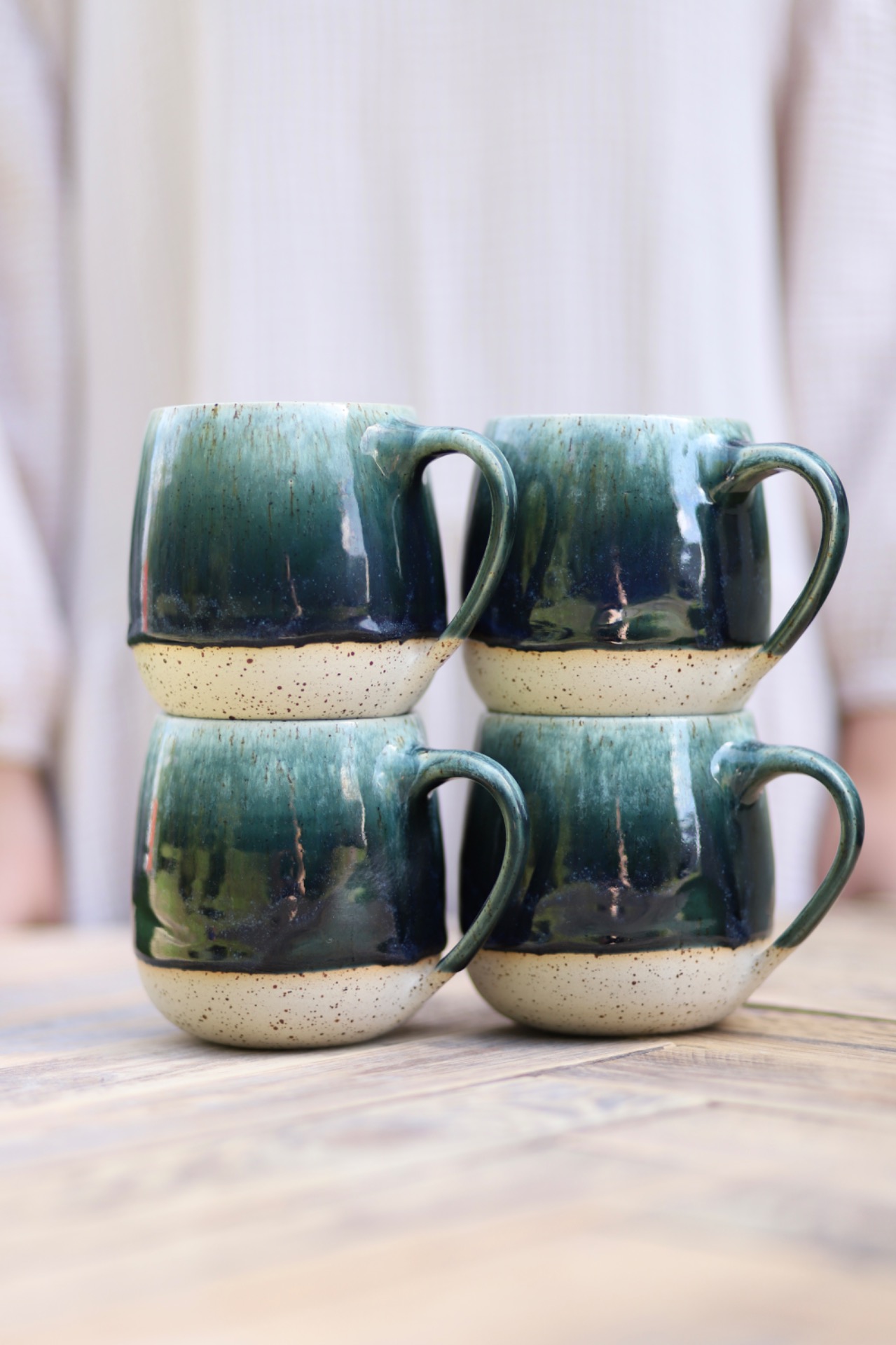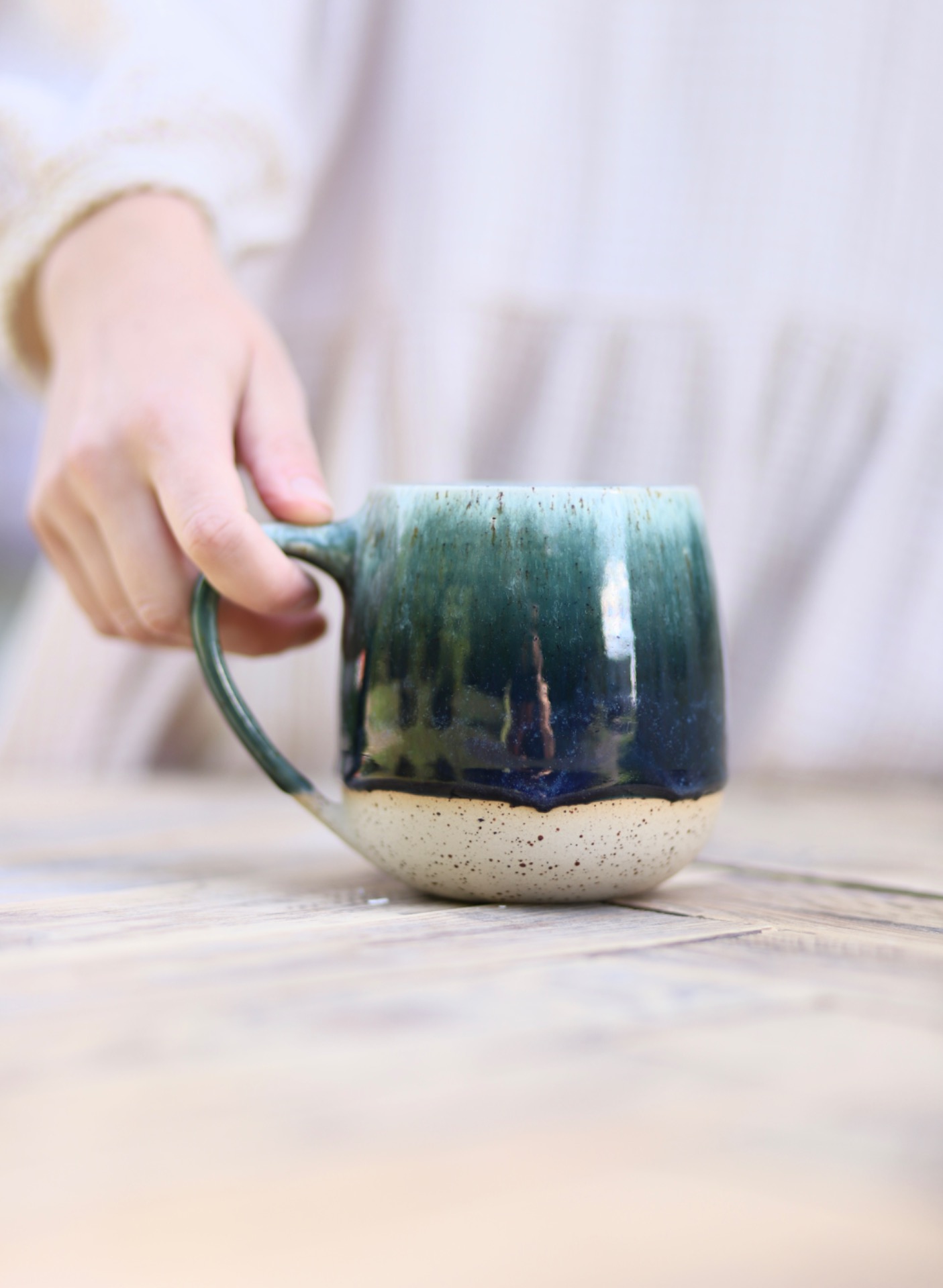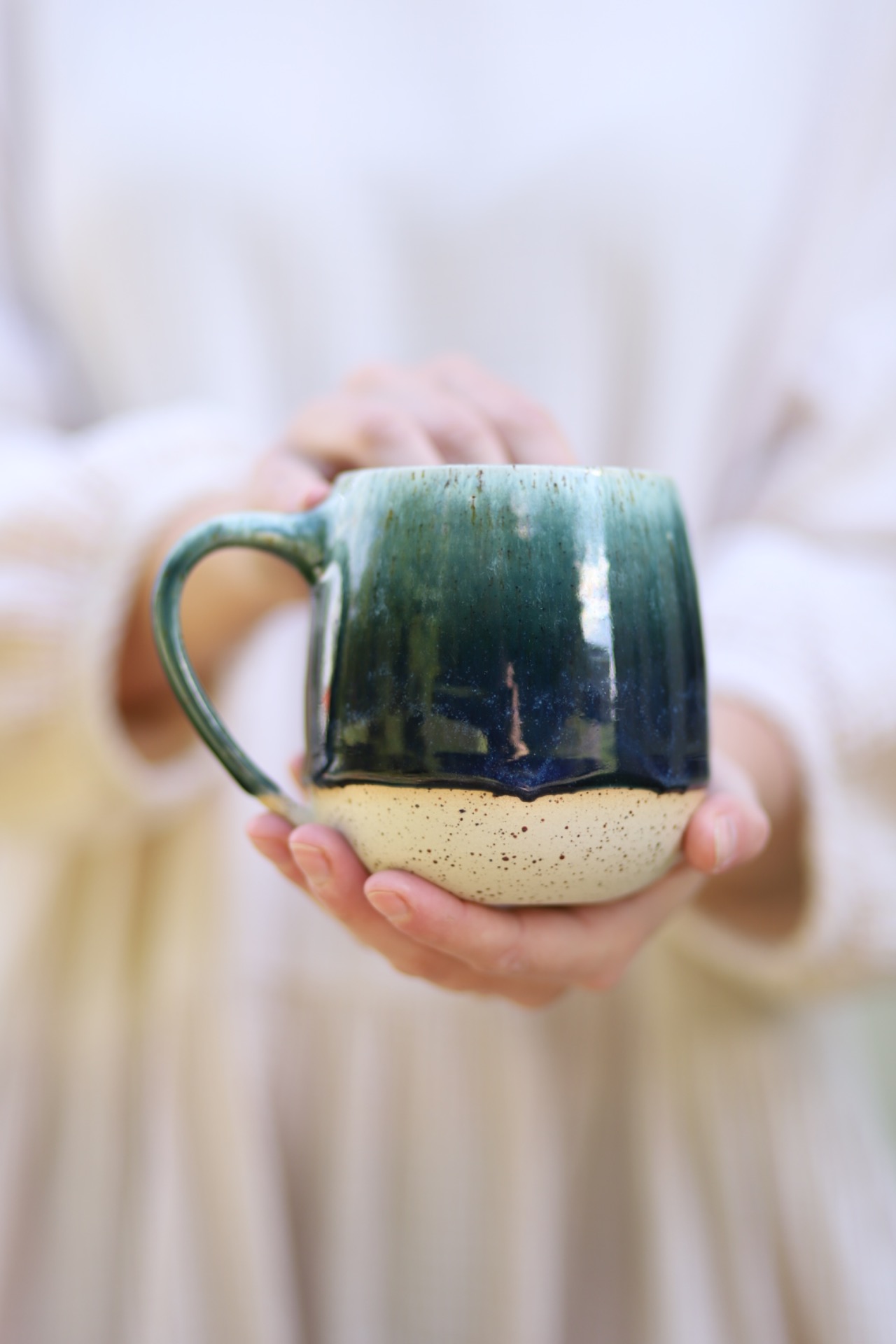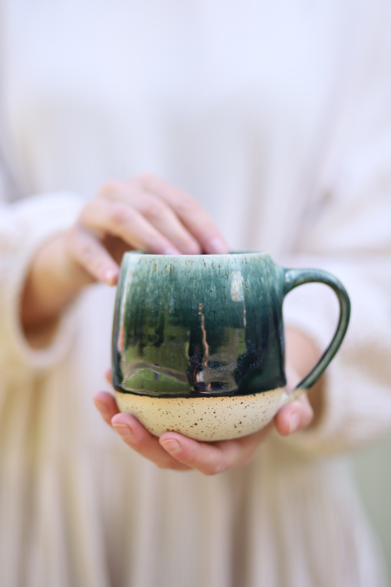 Hrnek na čaj s objemem cca 500-570ml s temnou zelenou glazurou. Hrnek je vytočen z tečkované kameniny a vypálen na vysoké teploty.